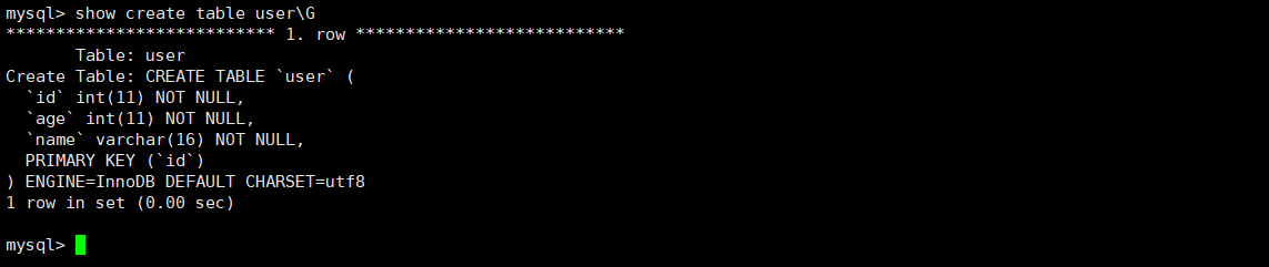 create table if not exists user (id int primary key, age int not null,name varchar(16) not null);