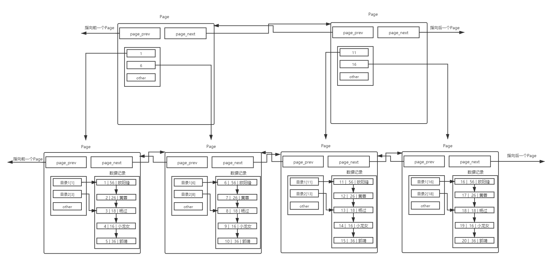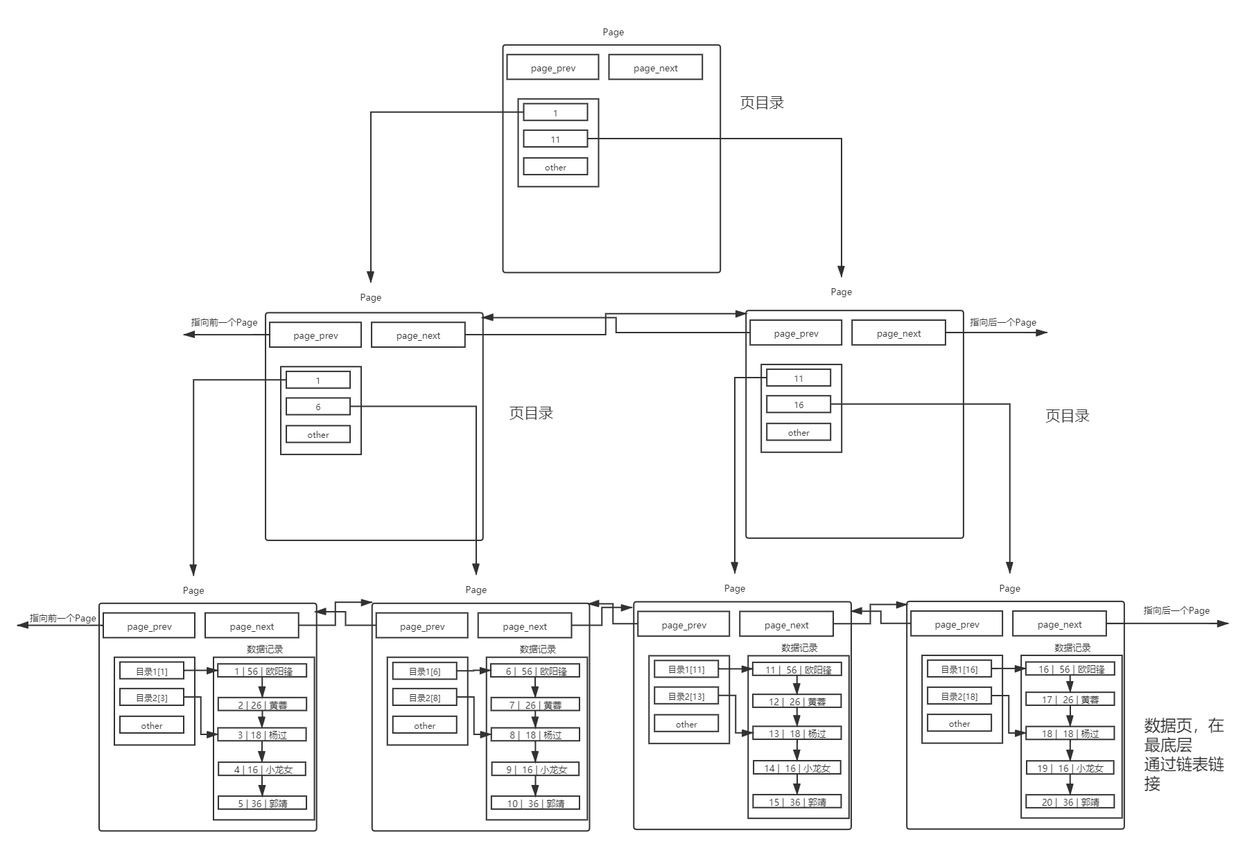 存在一個目錄頁來管理頁目錄,目錄頁中的數據存放的就是指向的那一頁中最小的數據。有數據,就可通過比較,找到該訪問那個Page,進而通過指針,找到下一個Page。其實目錄頁的本質也是頁,普通頁中存的數據是用戶數據,而目錄頁中存的數據是普通頁的地址。但是我們每次檢索數據的時候,應該從哪里開始,雖然頂層的目錄頁少了,但是還需要遍歷,不用擔心,可以在加目錄頁,哈哈,你沒想錯!
