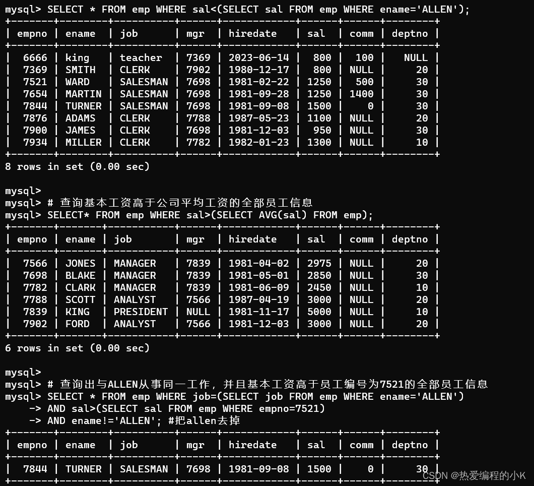 SELECT * FROM emp WHERE job=(SELECT job FROM emp WHERE ename='ALLEN') AND sal>(SELECT sal FROM emp WHERE empno=7521)#把ALLEN自己去掉AND ename<>'ALLEN';?效果如下: