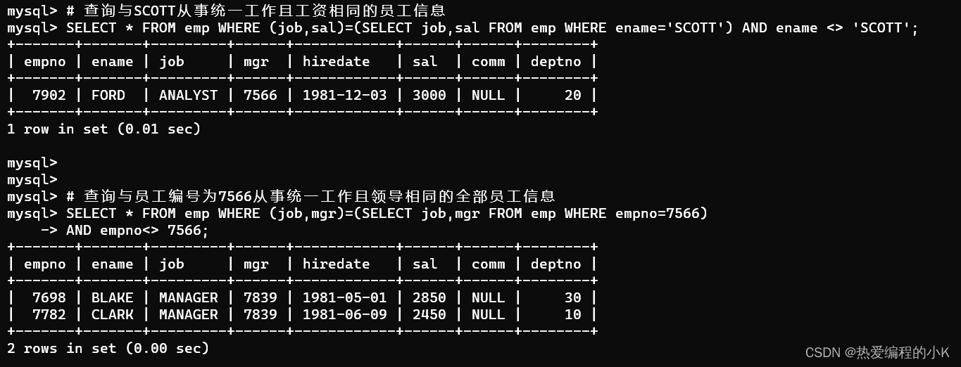SELECT * FROM emp WHERE (job,mgr)=(SELECT job,mgr FROM emp WHERE empno=7566)AND emp<>7566;?效果如下: