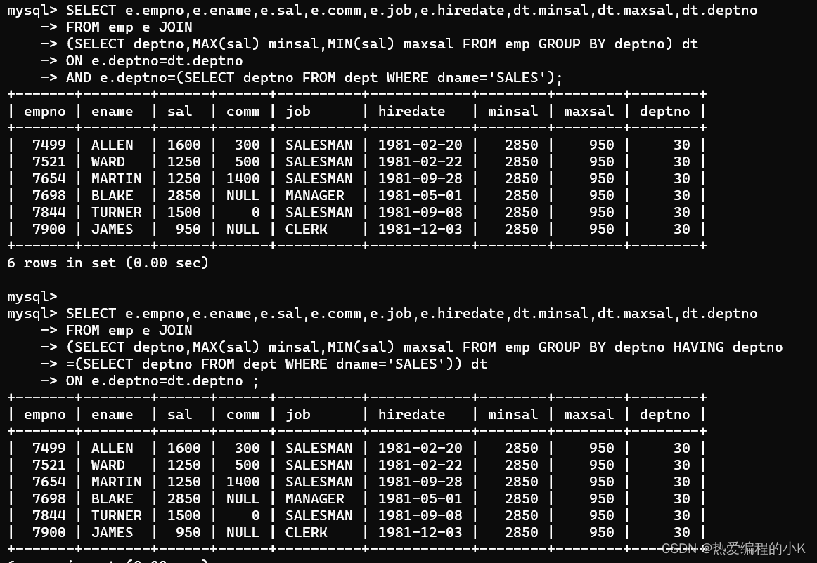 #1SELECT e.empno,e.ename,e.sal,e.comm,e.job,e.hiredate,minsal,maxsal,e.deptno FROM emp e JOIN (SELECT deptno,MIN(sal) minsal,MAX(sal) maxsal FROM emp GROUP BY deptno) tdON e.deptno=td.deptno AND e.deptno=(SELECT deptno FROM dept WHERE dname='SALES');#2SELECT e.empno,e.ename,e.sal,e.comm,e.job,e.hiredate,minsal,maxsal,e.deptno FROM emp e JOIN (SELECT deptno,MIN(sal) minsal,MAX(sal) maxsal FROM emp GROUP BY deptnoHAVING deptno=(SELECT deptno FROM dept WHERE dname='SALES')) tdON e.deptno=td.deptno;