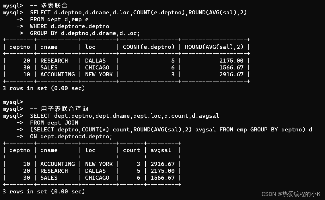 SELECT d.deptno,d.dname,d.loc,COUNT(e.deptno),ROUND(AVG(sal),2) FROMdept d LEFT JOIN emp eON e.deptno=d.deptnoGROUP BY d.deptno,d.dname,d.loc;SELECT dept.deptno,dept.dname,dept.loc,d.count,d.avgsal FROM dept LEFT JOIN (SELECT deptno,COUNT(*) count,AVG(sal) avgsal FROM emp GROUP BY deptno) dON dept.deptno=d.deptno;