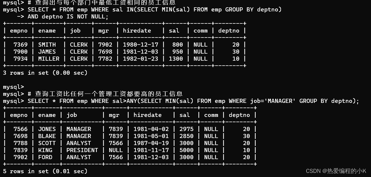 按照部門分組,統計每個部門的最低工資根據最低工資查詢出員工信息SELECT * FROM emp WHERE sal IN(SELECT MIN(sal) FROM emp GROUP BY deptno)AND deptno IS NOT NULL;ANY操作符