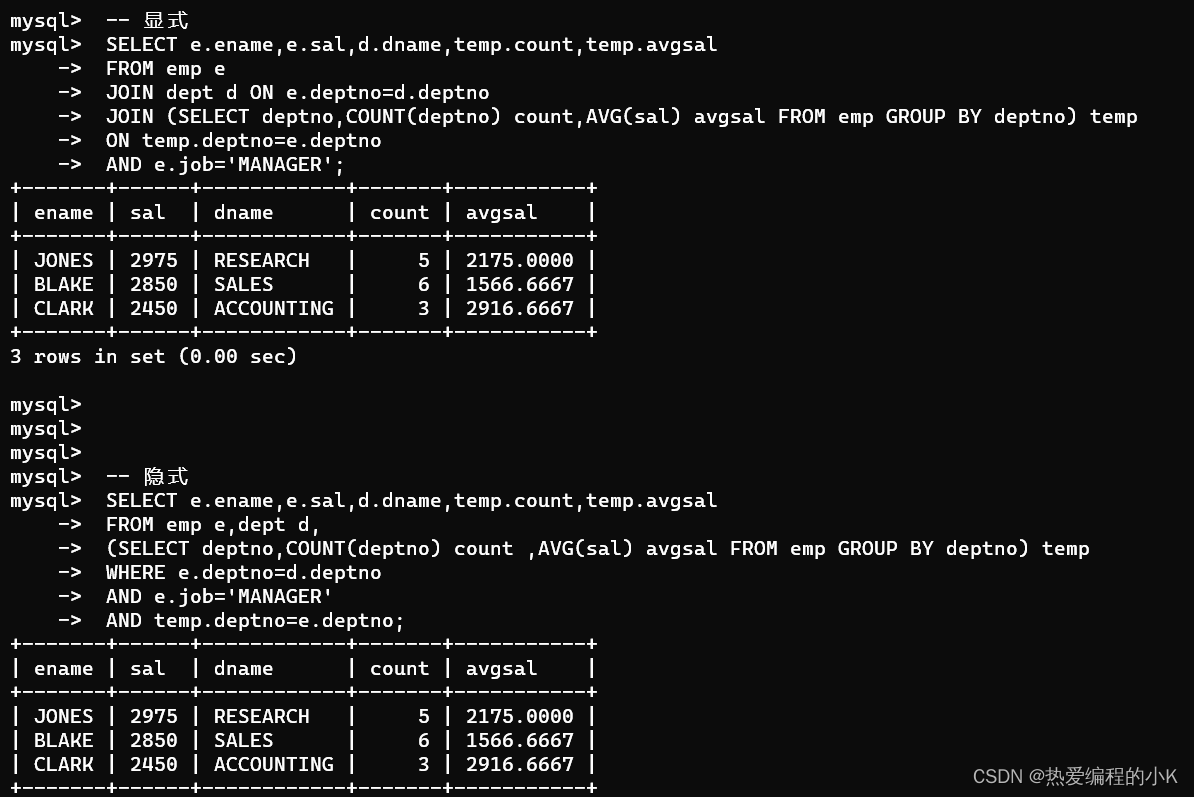 #隱式方式SELECT e.ename,e.sal,d.dname,temp.count,temp.avgsalFROM emp e,dept d,(SELECT deptno, COUNT(deptno) count,AVG(sal) avgsal FROM emp GROUP BY deptno) temp WHERE job='MANAGER' AND e.deptno=d.deptno AND temp.deptno=e.deptno; #顯示方式SELECT e.ename,e.sal,d.dname,temp.count,temp.avgsalFROM emp e JOIN dept d ON e.deptno=d.deptno JOIN (SELECT deptno, COUNT(deptno) count,AVG(sal) avgsal FROM emp GROUP BY deptno) temp ON temp.deptno=e.deptno AND job='MANAGER';