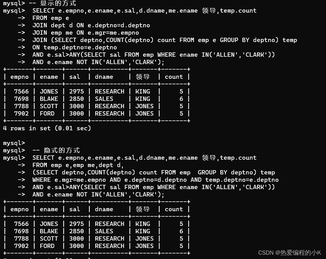 #隱式方式SELECT e.empno,e.ename,e.sal,d.dname,me.ename 領導,temp.count FROM emp e,dept d,emp me,(SELECT deptno,COUNT(deptno) count FROM emp e GROUP BY deptno) tempWHERE e.deptno=d.deptno AND e.mgr=me.empno AND temp.deptno=e.deptnoAND e.sal >ANY(SELECT sal FROM emp WHERE ename IN('ALLEN','CLARK'))AND e.ename NOT IN('ALLEN','CLARK');#顯示方式SELECT e.empno,e.ename,e.sal,d.dname,me.ename 領導,temp.count FROM emp e JOIN dept d ON e.deptno=d.deptnoLEFT JOIN emp me ON e.mgr=me.empnoJOIN (SELECT deptno,COUNT(deptno) count FROM emp e GROUP BY deptno) temp ON temp.deptno=e.deptnoAND e.sal >ANY(SELECT sal FROM emp WHERE ename IN('ALLEN','CLARK'))AND e.ename NOT IN('ALLEN','CLARK');