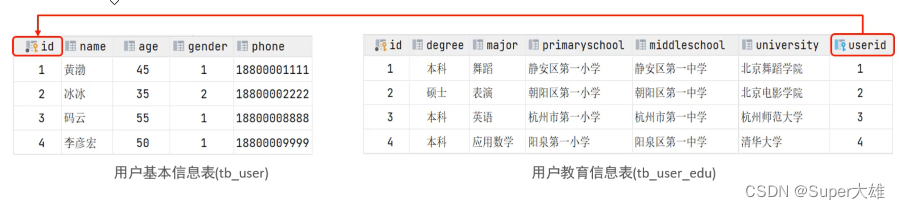1.1 一對一案例: 用戶與 用戶詳情的關系關系:一對一關系,多用于單表拆分,將一張表的基礎字段放在一張表中,其他詳情字段放在另一張表中,以提升操作效率