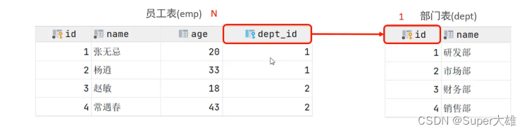 create table tb_user_edu( id int auto_increment comment '主鍵id'primary key, degreevarchar(20) null comment '學歷', major varchar(50) null comment '專業(yè)', primaryschool varchar(50) null comment '小學', middleschool varchar(50) null comment '中學', university varchar(50) null comment '大學', useridint null comment '用戶id', constraint useridunique (userid), constraint fk_useridforeign key (userid) references tb_user (id)) comment '用戶教育信息表'; 1.2 一對多(多對一)案例:部門與員工的關系 關系:一個部門對應多個員工,一個員工對應一個部門 實現(xiàn): 在多的一方建立外鍵,指向一的一方的主鍵