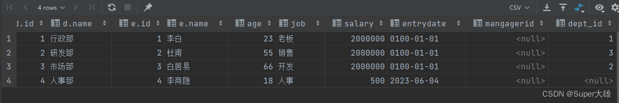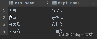create table dept( id int auto_increment comment 'id'primary key, name varchar(50) not null comment '部門名稱') comment '部門表'; create table emp( id int auto_increment comment 'id'primary key, name varchar(50) not null comment '姓名', ageint null comment '年齡', jobvarchar(20) null comment '職位', salary int null comment '薪水', entrydate datenull comment '入職時間', mangagerid int null comment '直屬的領導id', dept_id int null comment '部門id', constraint dept_idforeign key (dept_id) references dept (id)) comment '員工表';兩張表消除笛卡爾積的方法:emp.dept_id=dept.id