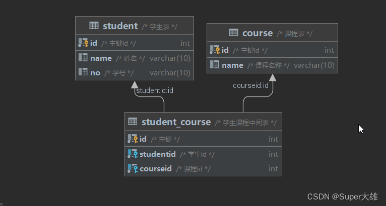 create table student_course( idint auto_increment comment '主鍵'primary key, studentid int not null comment '學生id', courseid int not null comment '課程id', constraint f_kcourseidforeign key (courseid) references course (id), constraint f_kstudentidforeign key (studentid) references student (id)) comment '學生課程中間表';