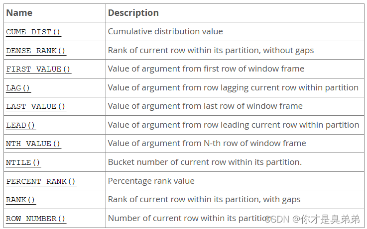 MySQL 官方文檔: https://dev.mysql.com/doc/refman/8.0/en/window-functions.html