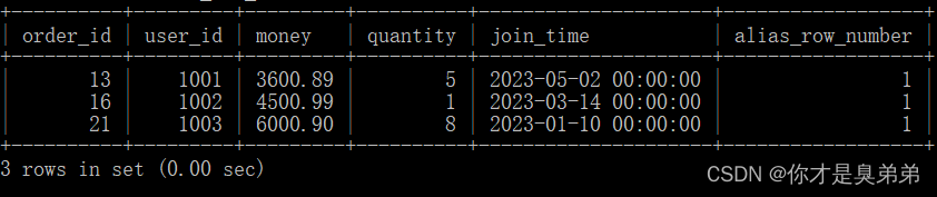 select *from (select *,row_number() over(partition by user_id order by money desc) as alias_row_numberfrom order_for_goods) twhere alias_row_number<=3;以上SQL語句使用了窗口函數 row_number() 來為每個分區內的行分配序號。然后,外部查詢從這些序號中選擇前三個最高的行。內部查詢從 order_for_goods 表中選擇了所有的列,并使用 row_number() 函數為每個分區內的行分配序號。在這個例子中,子查詢將數據是按照 user_id 列進行分區 ,按照 money 列的降序排列的。外部查詢從內部查詢的結果中選擇了序號小于等于 3 的行,這些行對應于分區內前三高的行。2、執行結果