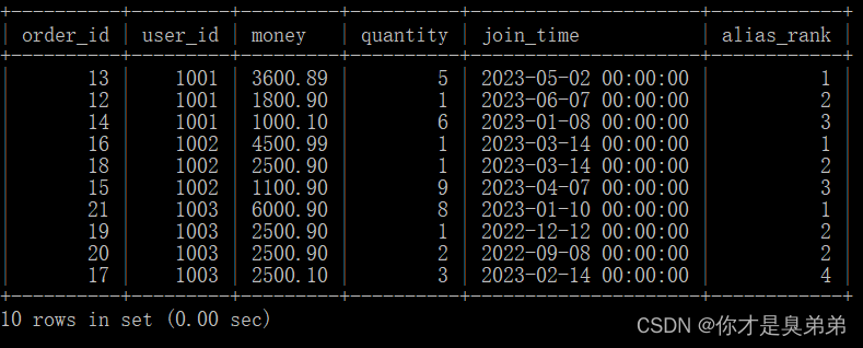 select *, row_number() over(partition by user_id order by money desc) as alias_row_number, rank() over(partition by user_id order by money desc) as alias_rank, dense_rank() over(partition by user_id order by money desc) as alias_dense_rankfrom order_for_goods; 從 order_for_goods 表中選擇了所有的列,并計算了每個用戶在每個訂單中的總金額,以及計算了每個用戶在每個訂單中的序號、排名和稠密排名。這個查詢使用了 row_number()、rank() 和 dense_rank() 函數來計算每個分區內的行的序號、排名和稠密排名。這些函數后面跟著 over() 子句,用于指定計算的窗口。在這個例子中,窗口是按照 user_id 分區,按照 money 列的降序排列的。2、執行結果