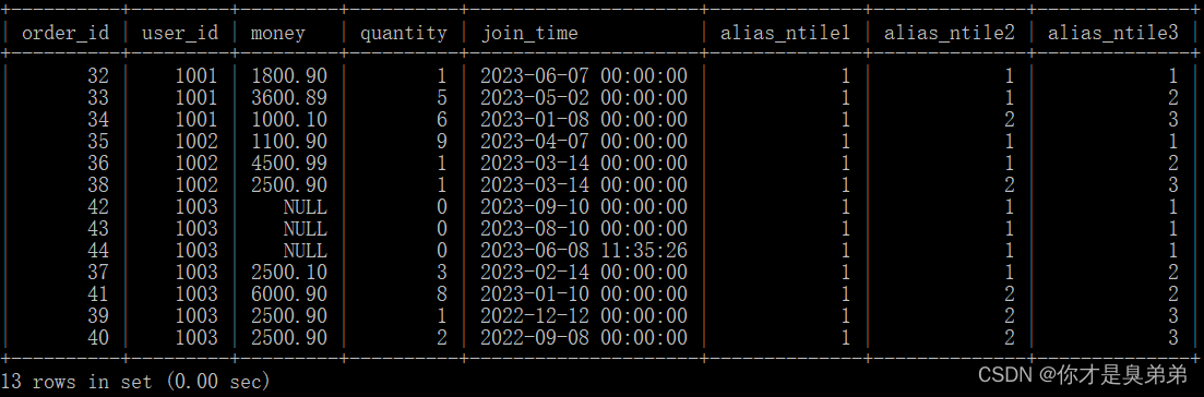 select *,last_value(money) over(partition by user_id order by join_time) as alias_last_value1,last_value(money) over(partition by user_id order by join_time rows between unbounded preceding and current row) as alias_last_value2,last_value(money) over(partition by user_id order by join_time rows between unbounded preceding and unbounded following) as alias_last_value3from order_for_goods; 可以看到別名 alias_last_value2 驗證了LAST_VALUE()默認統計范圍就是 rows between unbounded preceding and current row(表示從當前行開始向前沒有邊界地進行計算,即計算當前行之前的所有行的結果。) 可以看到別名 alias_last_value3 在指定 rows between unbounded preceding and unbounded following(表示從當前行開始向前和向后都沒有邊界地進行計算,即計算整個分區的結果。)全部統計情況下可以得到,user_id 分區,join_time 列排序,返回1001分區中字段money最后一筆交易金額為1800.90。+----------+---------+---------+----------+---------------------+------------------+------------------+------------------+| order_id | user_id | money | quantity | join_time | alias_last_value | alias_last_value | alias_last_value |+----------+---------+---------+----------+---------------------+------------------+------------------+------------------+| 34 | 1001 | 1000.10 |6 | 2023-01-08 00:00:00 | 1000.10 | 1000.10 | 1800.90 || 33 | 1001 | 3600.89 |5 | 2023-05-02 00:00:00 | 3600.89 | 3600.89 | 1800.90 || 32 | 1001 | 1800.90 |1 | 2023-06-07 00:00:00 | 1800.90 | 1800.90 | 1800.90 || 36 | 1002 | 4500.99 |1 | 2023-03-14 00:00:00 | 2500.90 | 4500.99 | 1100.90 || 38 | 1002 | 2500.90 |1 | 2023-03-14 00:00:00 | 2500.90 | 2500.90 | 1100.90 || 35 | 1002 | 1100.90 |9 | 2023-04-07 00:00:00 | 1100.90 | 1100.90 | 1100.90 || 40 | 1003 | 2500.90 |2 | 2022-09-08 00:00:00 | 2500.90 | 2500.90 | 2500.10 || 39 | 1003 | 2500.90 |1 | 2022-12-12 00:00:00 | 2500.90 | 2500.90 | 2500.10 || 41 | 1003 | 6000.90 |8 | 2023-01-10 00:00:00 | 6000.90 | 6000.90 | 2500.10 || 37 | 1003 | 2500.10 |3 | 2023-02-14 00:00:00 | 2500.10 | 2500.10 | 2500.10 |+----------+---------+---------+----------+---------------------+------------------+------------------+------------------+10 rows in set (0.00 sec)4.7、其它函數4.7.1、NTILE()函數1、語法說明