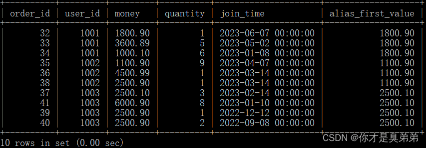 4.2.1、表結構DROP TABLE IF EXISTS `order_for_goods`;CREATE TABLE `order_for_goods` ( `order_id` int(0) NOT NULL AUTO_INCREMENT, `user_id` int(0) NULL DEFAULT NULL, `money` decimal(10, 2) NULL DEFAULT NULL, `quantity` int(0) NULL DEFAULT NULL, `join_time` datetime(0) NULL DEFAULT NULL, PRIMARY KEY (`order_id`) USING BTREE) ENGINE = InnoDB AUTO_INCREMENT = 12 CHARACTER SET = utf8 COLLATE = utf8_general_ci ROW_FORMAT = Dynamic;4.2.2、表數據INSERT INTO order_for_goods (user_id, money, quantity, join_time )VALUES( 1001, 1800.90, 1, '2023-06-07'),( 1001, 3600.89, 5, '2023-05-02'),( 1001, 1000.10, 6, '2023-01-08'),( 1002, 1100.90, 9, '2023-04-07'),( 1002, 4500.99, 1, '2023-03-14'),( 1003, 2500.10, 3, '2023-02-14'),( 1002, 2500.90, 1, '2023-03-14'),( 1003, 2500.90, 1, '2022-12-12'),( 1003, 2500.90, 2, '2022-09-08'), ( 1003, 6000.90, 8, '2023-01-10');4.2.3、普通函數做開窗函數1、語句如下