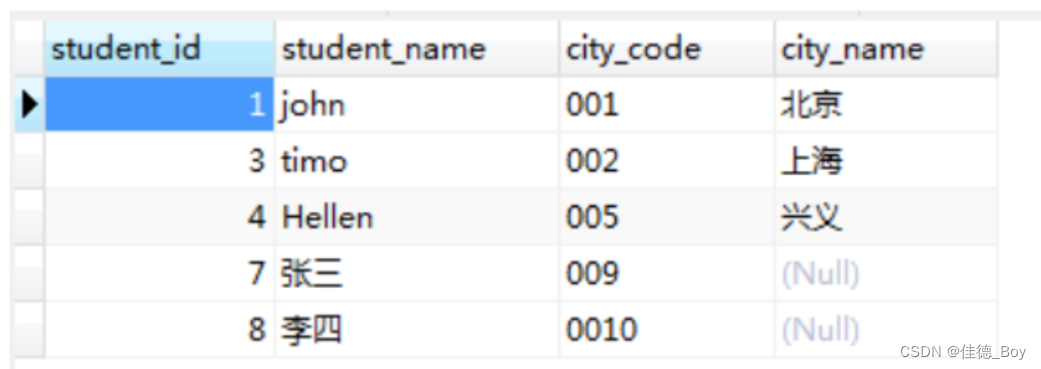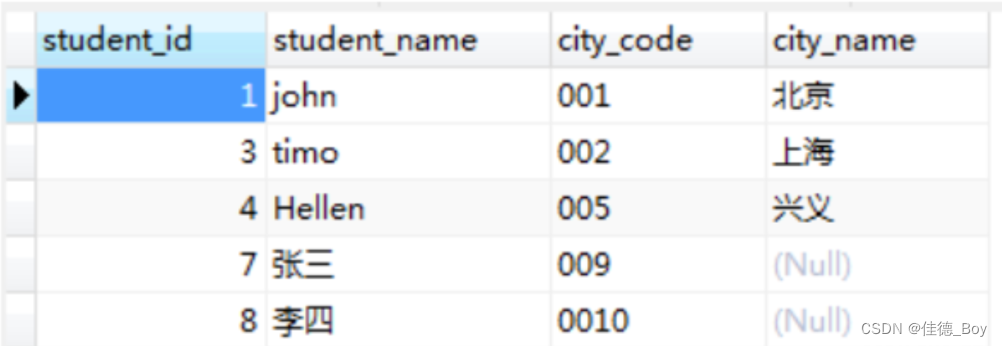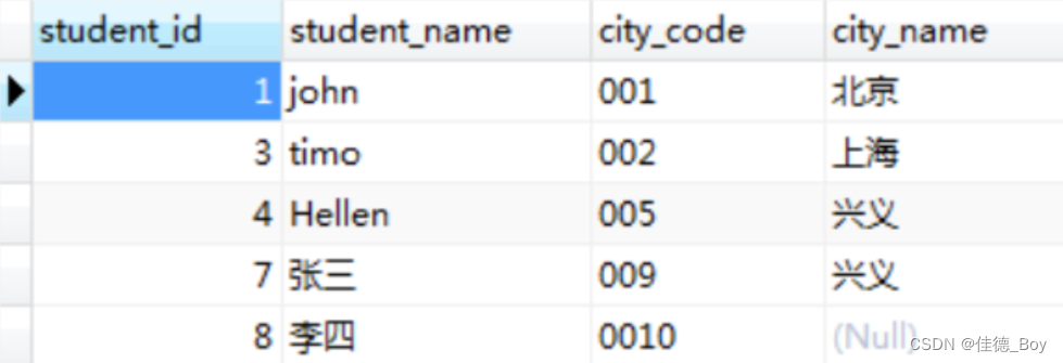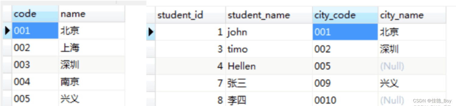 代碼對(duì)應(yīng)的城市更新,對(duì)應(yīng)錯(cuò)誤的更正;city表中沒(méi)有的城市,在people表里全被更新為null。方法二:UPDATE people LEFT JOIN city ON people.city_code=city.`code` SET people.city_name=city.`name`;結(jié)果: