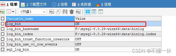 # 備份所有數(shù)據(jù)庫mysqldump -uroot -p123456 --all-databases > /backup/mysqldump/all.db# 恢復數(shù)據(jù)mysql -uroot -p db_name < /backup/mysqldump/db_name.db1、查看是否啟用 binlog 日志SHOW VARIABLES LIKE '%log_bin%'