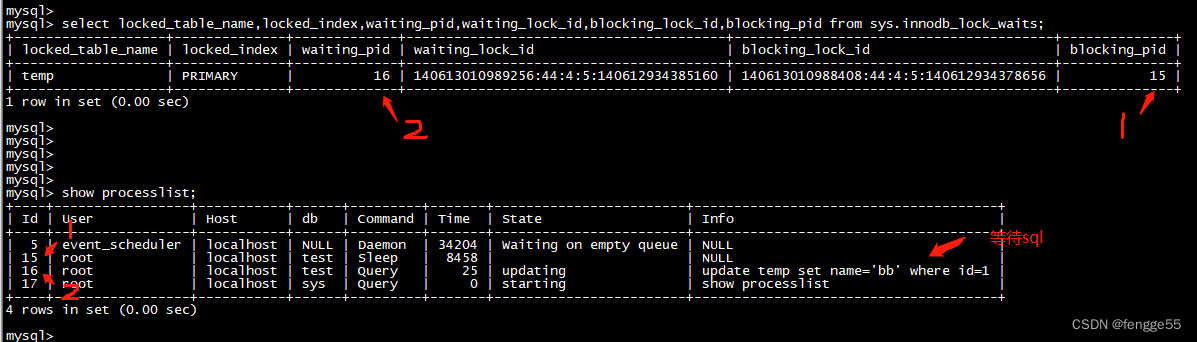 再次對比下。可以找到關系,1等待的事務處理,是被2阻塞了。也就是鎖住了,需要2釋放鎖,1才可以執行
