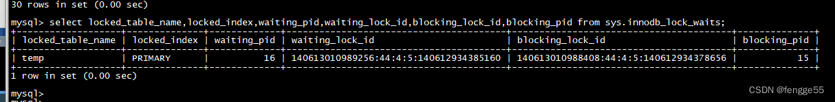 mysql> select locked_table_name,locked_index,waiting_pid,waiting_lock_id,blocking_lock_id,blocking_pid from sys.innodb_lock_waits;