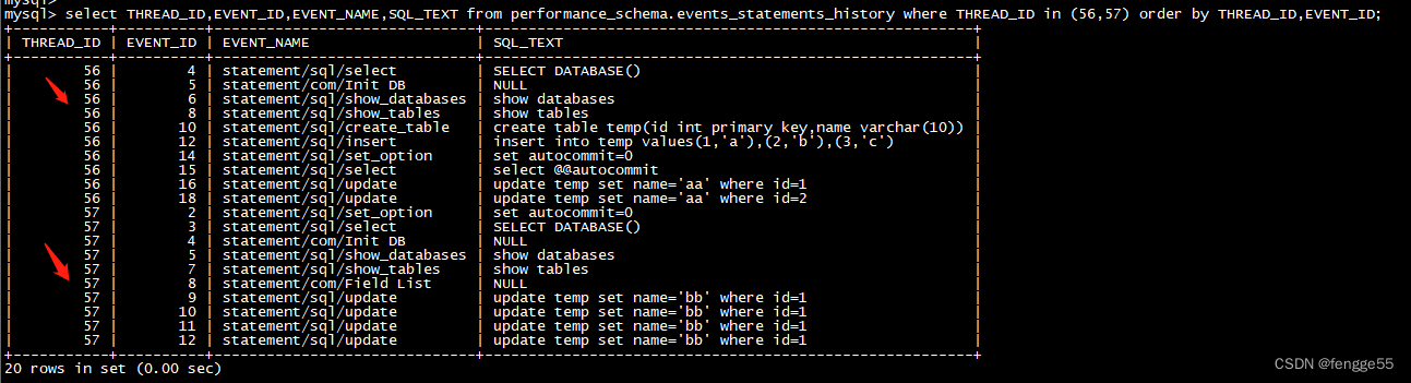 mysql> select THREAD_ID,EVENT_ID,EVENT_NAME,SQL_TEXT from performance_schema.events_statements_history where THREAD_ID in (56,57) order by THREAD_ID,EVENT_ID;