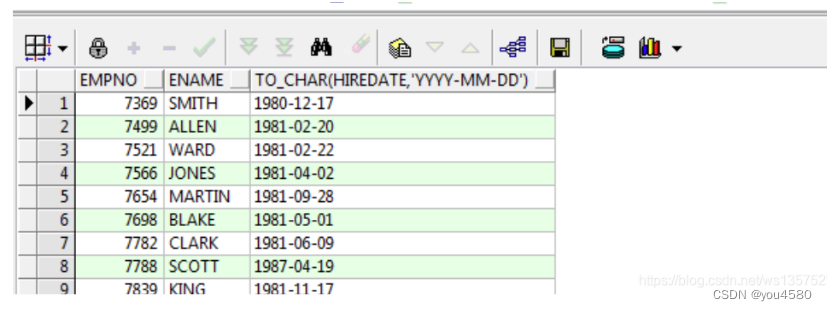 ----查詢出emp表中所有員工入職距離現在幾天。select sysdate-e.hiredate from emp e; 結果:以天為單位的小數----算出明天此刻select sysdate+1 from dual; 結果:2020/12/4 16:35:36----查詢出emp表中所有員工入職距離現在幾月。select months_between(sysdate,e.hiredate) from emp e; 結果:以月為單位的小數----查詢出emp表中所有員工入職距離現在幾年。select months_between(sysdate,e.hiredate)/12 from emp e; 結果:以年為單位的小數----查詢出emp表中所有員工入職距離現在幾周。select round((sysdate-e.hiredate)/7) from emp e; 結果:以周為單位的小數4、轉換函數4.1日期轉字符串:to_char()---日期轉字符串select to_char(sysdate, 'yyyy-mm-dd hh:mi:ss') from dual;結果:2020-12-04 05:18:03 12小時有0select to_char(sysdate, 'fm yyyy-mm-dd hh:mi:ss') from dual; 結果:2020-12-4 5:18:32 12小時無0select to_char(sysdate, 'fm yyyy-mm-dd hh24:mi:ss') from dual; 結果: 2020-12-4 17:18:47 24小時無0可以使用 TO_CHAR 函數來拆分年月日select empno,ename to_char(hiredate,'yyyy') 年, to_char(hiredate,'mm') 月, to_char(hiredate,'dd') 日from emp;
