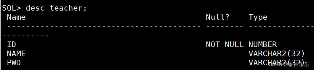 目錄一、簡單建表二、查看表結(jié)構(gòu)(在Xshell中輸入才能夠執(zhí)行)三、設(shè)置自增序列(一)普通自增序列(二)復雜序列四、修改表中的數(shù)據(jù)總結(jié)一、簡單建表CREATE TABLE teacher1( id number, name varchar2(32), primary key (id)); select * from teacher1; -- 插入數(shù)據(jù)insert into teacher1(id, name) VALUES (7, 'zhangsan'); -- 插入數(shù)據(jù)后確認無誤一定要提交,否則不會保存commit ; -- 修改表名alter table teacher rename to teacher1; -- 刪除表drop table teacher1; -- 提交事務(wù)commit;二、查看表結(jié)構(gòu)(在Xshell中輸入才能夠執(zhí)行)