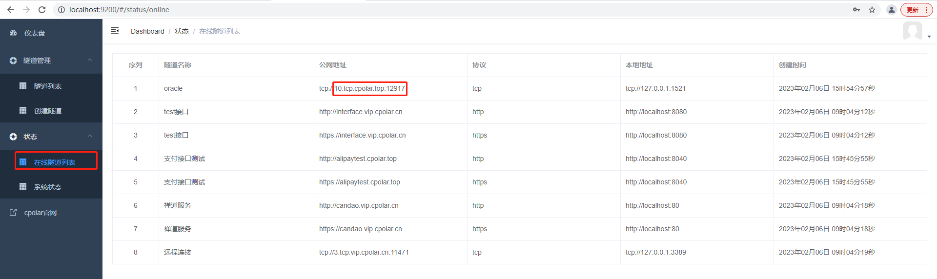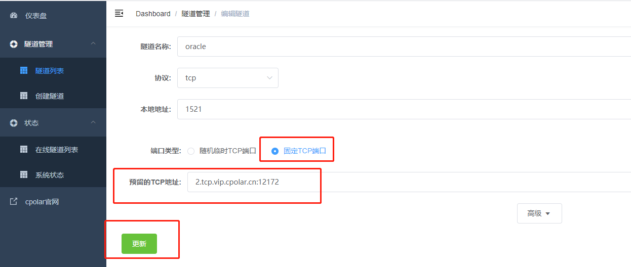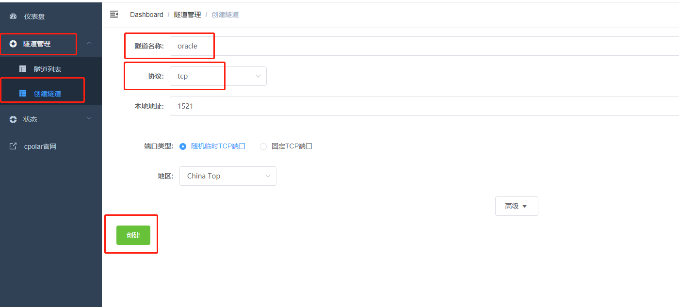 登錄成功后,點(diǎn)擊左側(cè)儀表盤的隧道管理——創(chuàng)建隧道,創(chuàng)建一個 tcp 協(xié)議的隧道指向本地 1521 端口(oracle默認(rèn)端口)