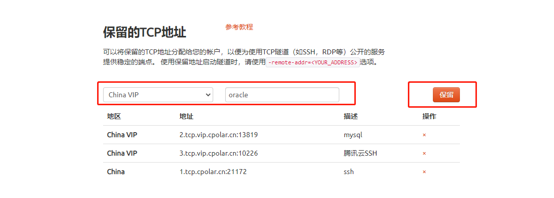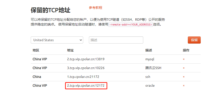 4.1 保留一個固定的公網(wǎng)TCP端口地址登錄 cpolar 官網(wǎng),點(diǎn)擊左側(cè)的預(yù)留,選擇保留的 TCP 地址,我們先來為遠(yuǎn)程 Oracle 保留一個固定端口地址。
