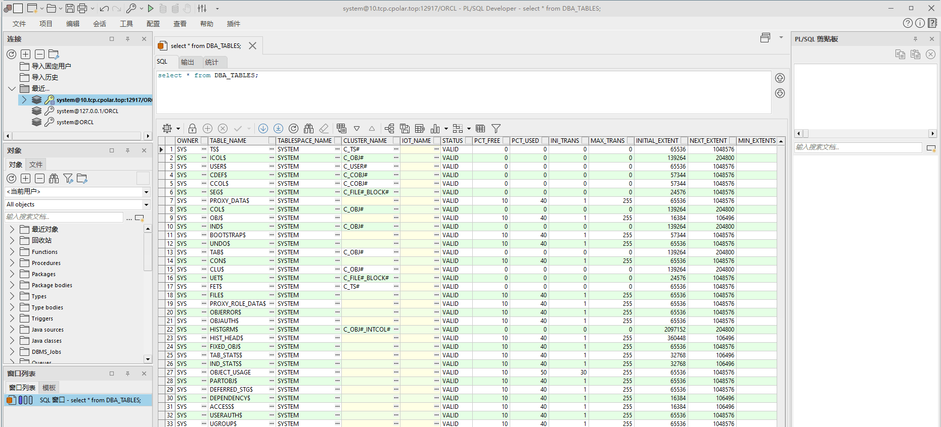 登錄后執(zhí)行查詢系統(tǒng)表格 select * from DBA_TABLES,出現(xiàn)數(shù)據(jù)表示連接成功