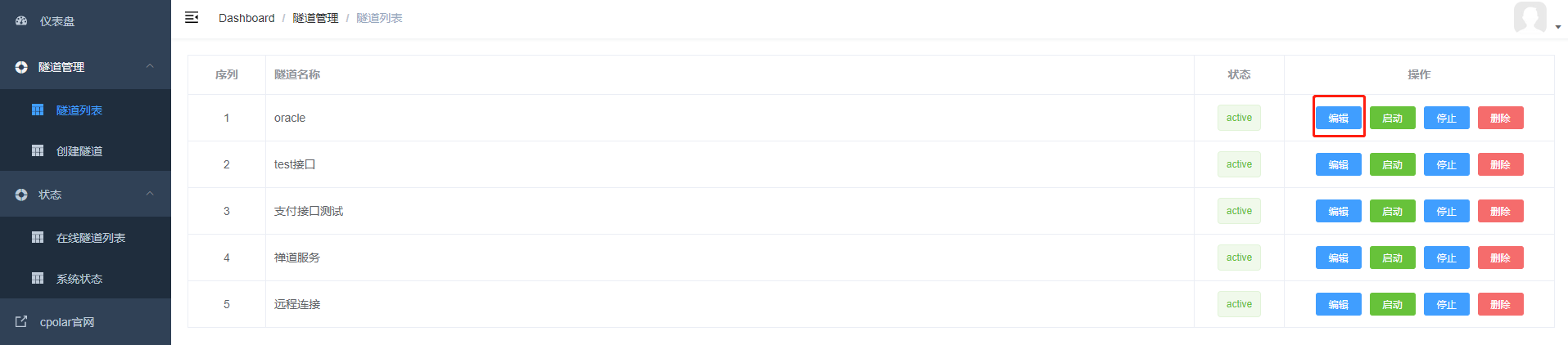 登錄成功后,點擊左側儀表盤的隧道管理——創建隧道,創建一個tcp協議的隧道指向本地1521端口(oracle默認端口)