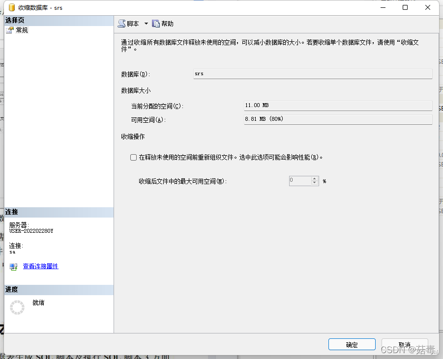 在收縮數(shù)據(jù)界面展示的是數(shù)據(jù)庫 srs 的基本信息,若需要進行收縮操作,需要先選中在釋放未使用的空間前重新組織文件。選中此項可能會影響性能(R),再收縮后文件中的最大可用空間中選擇收縮后的空間,單擊確定,即可完成手動收縮數(shù)據(jù)庫操作;