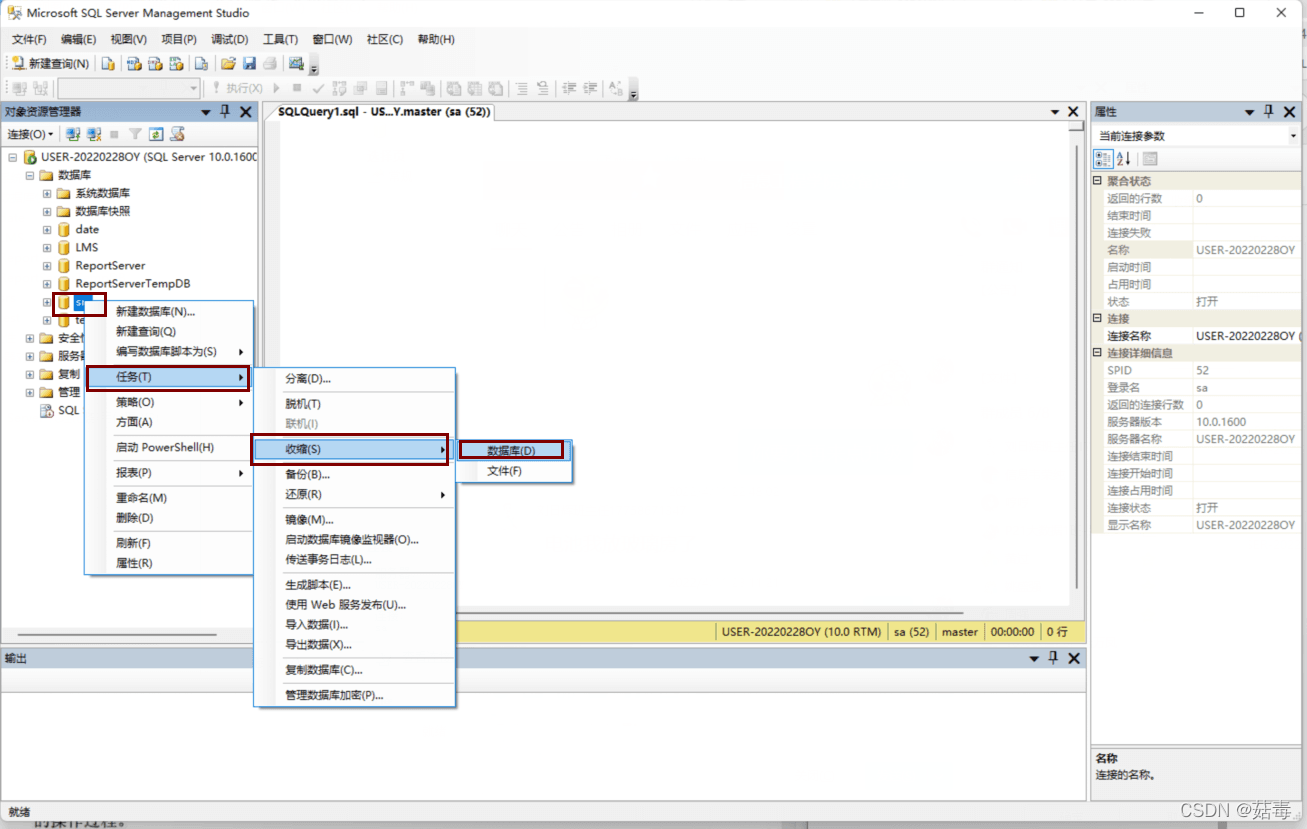 展開數(shù)據(jù)庫,右擊要收縮的數(shù)據(jù)庫;任務(wù) → 收縮 → 單擊數(shù)據(jù)庫