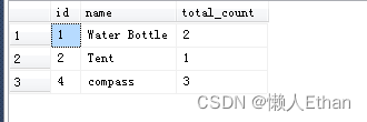 with cte1 as (select * from products where total_count > 0),cte2 as (select * from (select cte1.id, cte1.name, (cte1.total_count -1) as total_count from cte1join products p1 on cte1.id = p1.id) t where t.total_count > 0),cte3 as (select * from (select cte2.id, cte2.name, (cte2.total_count -1) as total_count from cte2join products p1 on cte2.id = p1.id) t where t.total_count > 0)select * from cte3輸出結果如下: