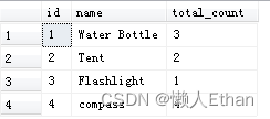 with cte1 as (select * from products where total_count > 0),cte2 as (select * from (select cte1.id, cte1.name, (cte1.total_count -1) as total_count from cte1join products p1 on cte1.id = p1.id) t where t.total_count > 0),cte3 as (select * from (select cte2.id, cte2.name, (cte2.total_count -1) as total_count from cte2join products p1 on cte2.id = p1.id) t where t.total_count > 0),cte4 as (select * from (select cte3.id, cte3.name, (cte3.total_count -1) as total_count from cte3join products p1 on cte3.id = p1.id) t where t.total_count > 0)select * from cte4輸出結果:
