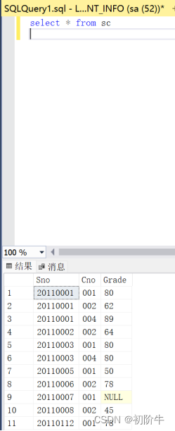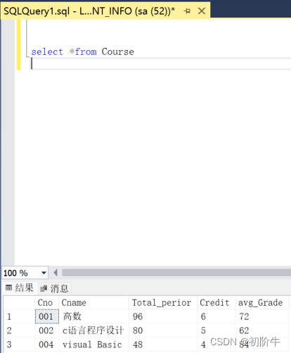 update courseset avg_Grade= (select AVG(Grade) from scwhere sc.Cno=Course.Cno)查看Course表: