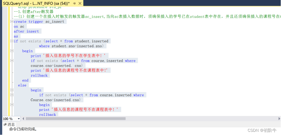 三、使用SQL語句創(chuàng)建觸發(fā)器實(shí)例1.創(chuàng)建after融發(fā)器(1)創(chuàng)建一個(gè)在插入時(shí)觸發(fā)的觸發(fā)器sc_insert,當(dāng)向sc表插入數(shù)據(jù)時(shí),須確保插入的學(xué)號已在student表中存在,并且還須確保插入的課程號在Course表中存在﹔若不存在,則給出相應(yīng)的提示信息,并取消插入操作,提示信息要求指明插入信息是學(xué)號不滿足條件還是課程號不滿足條件(注:Student表與sc表的外鍵約束要先取消)。