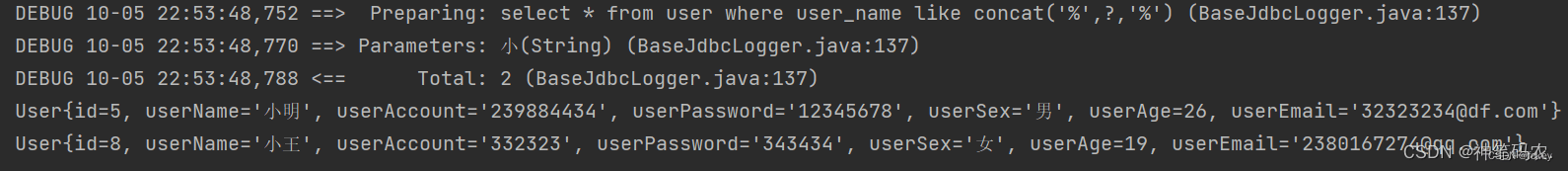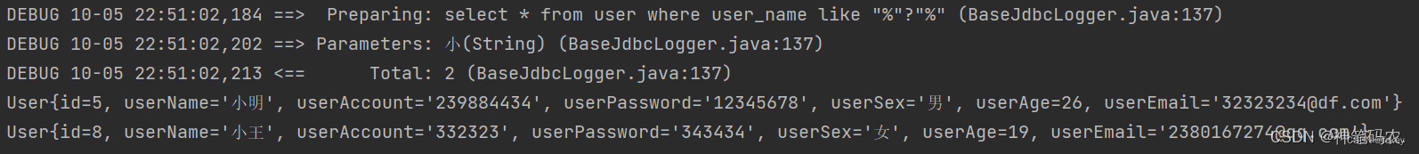 <select resultType='pojo.User'> select * from user where user_name like '%'#{username}'%'</select>執(zhí)行結(jié)果