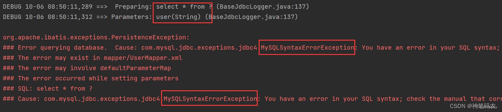 <select resultType='pojo.User'> select * from #{tableName}</select>結(jié)果報錯,原因在于#{}為占位符賦值,傳參為String的話就會自動補上單引號'',而表名不允許添加單引號,所以導(dǎo)致出錯。