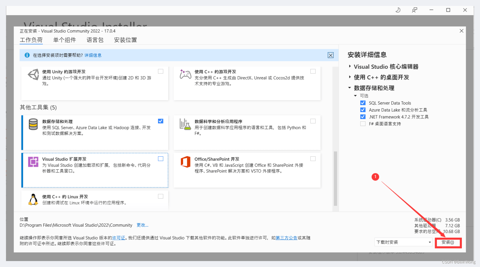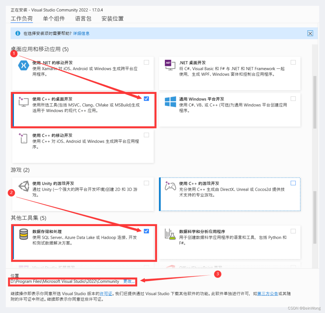 這里勾選使用C++的桌面開(kāi)發(fā)和數(shù)據(jù)存儲(chǔ)和處理。有需要更改默認(rèn)安裝路徑的要在第3步更改,不需要無(wú)需做第3步