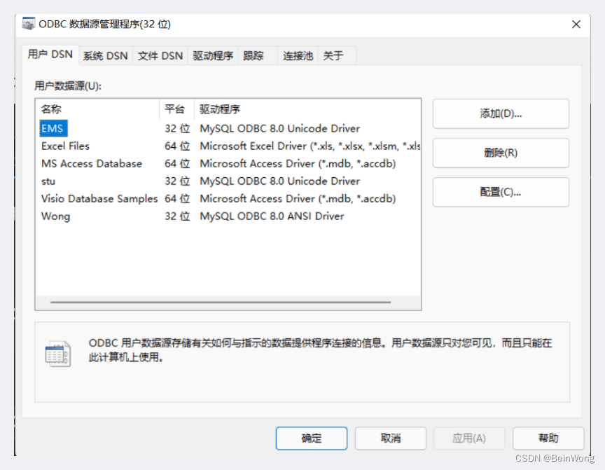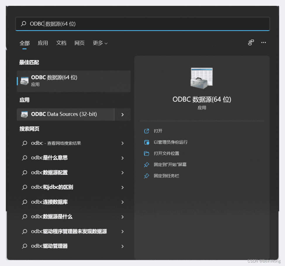CREATE DATABASE [Test] ON PRIMARY ( NAME = N'Test', FILENAME = N'D:\Program Files (x86)\Microsoft SQL Server\MSSQL10_50.SQLEXPRESS\MSSQL\DATA\Test.mdf' , SIZE = 3072KB , FILEGROWTH = 1024KB ) LOG ON ( NAME = N'Test_log', FILENAME = N'D:\Program Files (x86)\Microsoft SQL Server\MSSQL10_50.SQLEXPRESS\MSSQL\DATA\Test_log.ldf' , SIZE = 1024KB , FILEGROWTH = 10%)GOuse Testgocreate table baseInfor(no int, name char(20), passWord char(10), other char(20))goinsert into baseInfor values(1001, '學(xué)生1', '1001', '計(jì)算機(jī)科學(xué)與技術(shù)'), (1001, '老師1', '1001', '講師'), (2001, '管理員', '2001', '管理員')go2. 利用ODBC建立連接在搜索框搜索ODBC,選擇對(duì)應(yīng)的位數(shù)。本例以O(shè)DBC64位為例