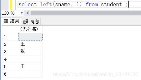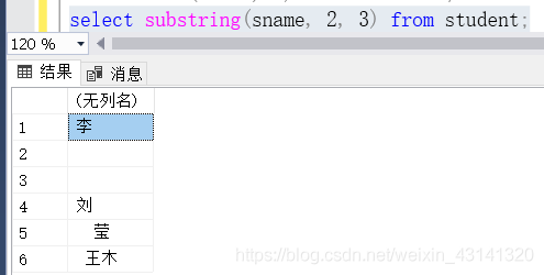 這里選出的結果有的為空是因為原關系中sname有些開頭有空格。而substring()的用法更為靈活,它指定了從str的第幾個元素開始,即start的作用,如從sname的第二個字符開始選擇三個字符: