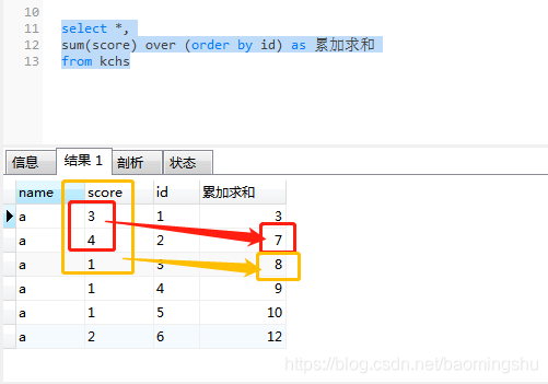 select *,sum(score) over (order by id) as 累加求和from kchs