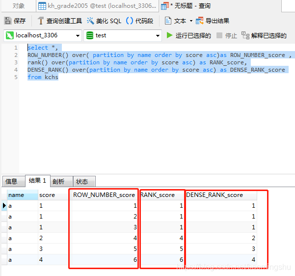 rank() over(partition by name order by score asc) as RANK_scoreDENSE_RANK()和RANK()類似,不同的是如果有相同的序號(hào),那么接下來(lái)的序號(hào)不會(huì)間斷。例如:有三個(gè)人并列第一,第四名序號(hào)為2(111234)
