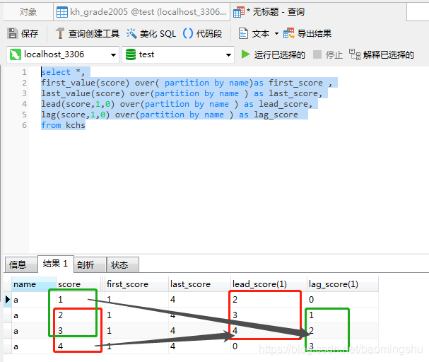 lag(score,1,0) over(partition by name ) as lag_score --根據(jù)name分區(qū)(組),score列當(dāng)前行的下面N行,如果沒(méi)有就為默認(rèn)值0
