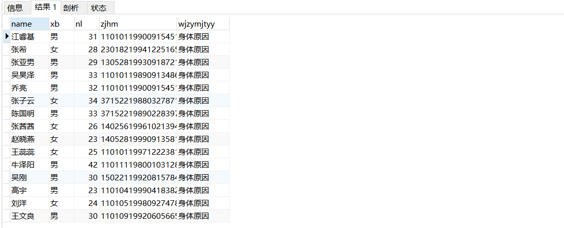查詢表中name、xb、nl、zjhm、wjzymjtyy字段的數據。
