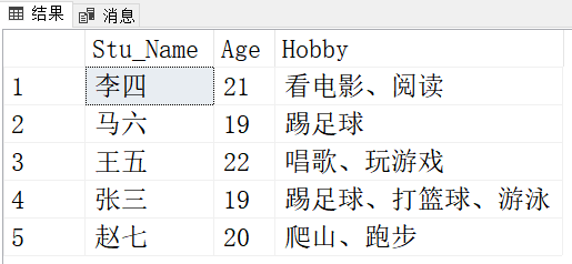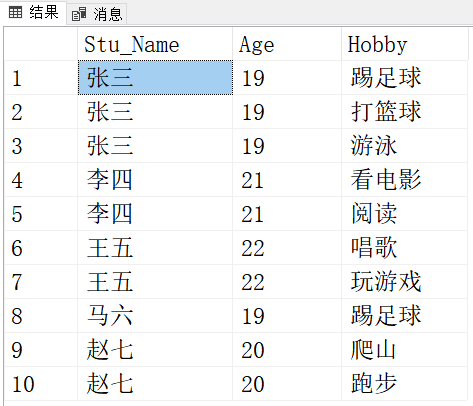 CREATE TABLE Stu_Hobby(Stu_Name NVARCHAR(20),--姓名Age INT,--年齡Hobby NVARCHAR(20) --愛好)INSERT INTO Stu_HobbyVALUES ( N"張三",19,N"踢足球"), ( N"張三",19,N"打籃球"), ( N"張三",19,N"游泳"), ( N"李四",21,N"看電影"), ( N"李四",21,N"閱讀"), ( N"王五",22,N"唱歌"), ( N"王五",22,N"玩游戲"), ( N"馬六",19,N"踢足球"), ( N"趙七",20,N"爬山"), ( N"趙七",20,N"跑步")