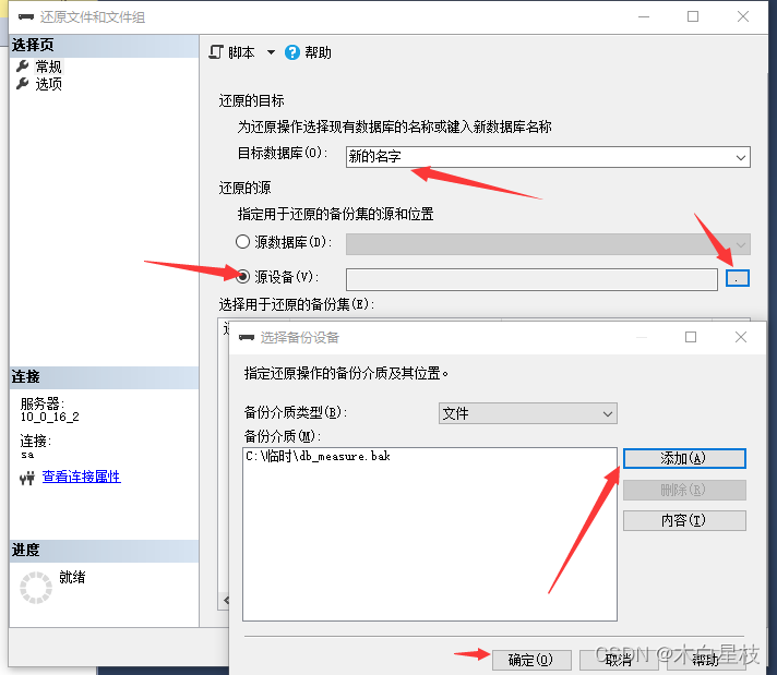 然后設(shè)置目標(biāo)數(shù)據(jù)庫的名字,如果數(shù)據(jù)庫中已經(jīng)存在相同名字的,則需要修改或者刪除原來同名的數(shù)據(jù)庫,然后在選擇源設(shè)備,點(diǎn)擊右邊的。。。點(diǎn)擊彈出框中的添加,找到要備份文件的位置,點(diǎn)擊確定。