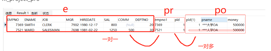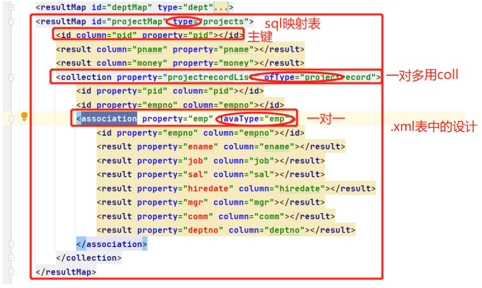 <?xml version="1.0" encoding="UTF-8" ?><!DOCTYPE mapperPUBLIC "-//mybatis.org//DTD Mapper 3.0//EN""http://mybatis.org/dtd/mybatis-3-mapper.dtd"><mapper namespace="com.msb.mapper.EmpMapper"> <!--resultMap是一個映射表,對應的字段會對應數據表的字段 --> <resultMap id="projectMap" type="projects"><id column="pid" property="pid"></id><result column="pname" property="pname"></result><result column="money" property="money"></result><collection property="projectrecordList" ofType="projectrecord"> <id property="pid" column="pid"></id> <id property="empno" column="empno"></id> <association property="emp" javaType="emp"><id property="empno" column="empno"></id><result property="ename" column="ename"></result><result property="job" column="job"></result><result property="sal" column="sal"></result><result property="hiredate" column="hiredate"></result><result property="mgr" column="mgr"></result><result property="comm" column="comm"></result><result property="deptno" column="deptno"></result> </association></collection> </resultMap> <!--Projects findPiddle(int pid);--> <select id="findPiddle" resultMap="projectMap">select *from emp einner join projectrecord pr on pr.empno=e.empnoinner join projects po on po.pid= pr.pidwhere pr.pid=#{pid} </select></mapper>//mapper表package com.msb.mapper;import com.msb.pojo.Dept;import com.msb.pojo.Emp;import com.msb.pojo.Projects;import java.util.List;public interface EmpMapper { /** * 實現根據項目編號查看所有參與項目的人員信息 * @param pid 傳入項目號 * @return 返回一個project的對象 */ Projects findPiddle(int pid);}package com.msb.pojo;//一對一關系引入import lombok.AllArgsConstructor;import lombok.Data;import lombok.NoArgsConstructor;import java.io.Serializable;@Data@AllArgsConstructor@NoArgsConstructorpublic class Projectrecord implements Serializable { private int empno; private int pid; //pr和e是一對一的關系 private Emp emp;}package com.msb.pojo;//一對多關系實體類設計import lombok.AllArgsConstructor;import lombok.Data;import lombok.NoArgsConstructor;import java.io.Serializable;import java.util.List;@NoArgsConstructor@AllArgsConstructor@Datapublic class Projects implements Serializable { private int pid; private String pname; private int money; //po和pr是一對多的關系 List<Projectrecord> projectrecordList;}package com.msb.pojo;import lombok.AllArgsConstructor;import lombok.Data;import lombok.NoArgsConstructor;import java.sql.Date;@Data@AllArgsConstructor@NoArgsConstructorpublic class Emp { private Integer empno; private String ename; private String job; private Integer mgr; private Date hiredate; private Integer sal; private Integer comm; private Integer deptno; private Dept dept;}jdbc_driver=com.mysql.cj.jdbc.Driverjdbc_url=jdbc:mysql://127.0.0.1:3306/testtable?useSSL=false&useUnicode=true&characterEncoding=UTF-8&serverTimezone=Asia/Shanghaijdbc_username=rootjdbc_password=root