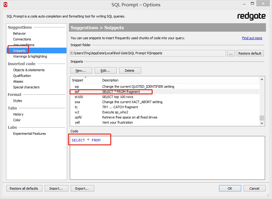 當然了,Sql Prompt 支持自定義代碼段,用戶可以根據自己的需求去添加。