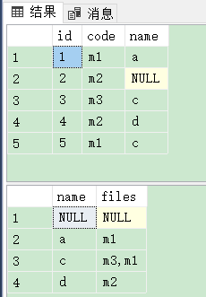declare @table1 table ( id int ,code varchar(10) , name varchar(20) ); insert into @table1 ( id,code, name ) values ( 1, "m1","a" ), ( 2, "m2",null ), ( 3, "m3", "c" ), ( 4, "m2","d" ), ( 5, "m1","c" );select * from @table1;select name, files=stuff((select ","+convert(varchar, code) from @table1 b where a.name=b.name for xml path("")), 1, 1, "")from @table1 agroup by name;結果: