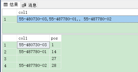 declare @moulds varchar(4000);set @moulds="55-480730-03,55-487780-01,, 55-487780-02 ";declare @table1 table(col1 nvarchar(4000));declare @table2 table(col1 nvarchar(40), pos int);insert into @table1 values(replace(@moulds, char(13)+char(10), ""));select * from @table1;insert into @table2select rtrim(ltrim(replace(substring(A.col1, B.number, charindex(",", A.col1+",", B.number)-B.number) , char(9), "") )) as col2, B.numberfrom @table1 A inner join master..spt_values B on charindex(",", ","+A.col1, B.number)=B.numberwhere B.type="P";select * from @table2;結果:
